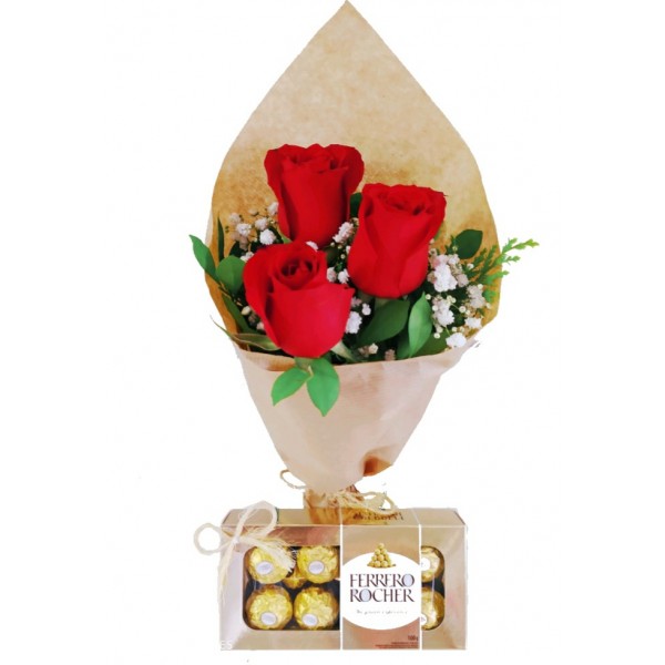 3 Rosas Vermelhas, pepel craft, Laço decorativo e bombom ferrero rocher com 8 unidades. O produto mostrado na imagem é apenas para fins de referência